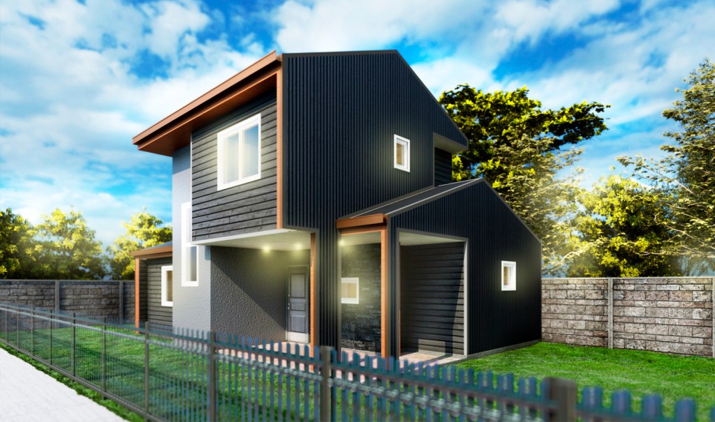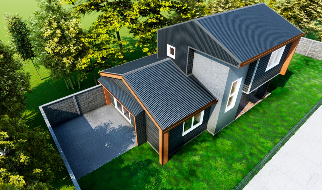 Revestida en siding de fibrocemento, zinc, texturizado de marmolina y piedra.