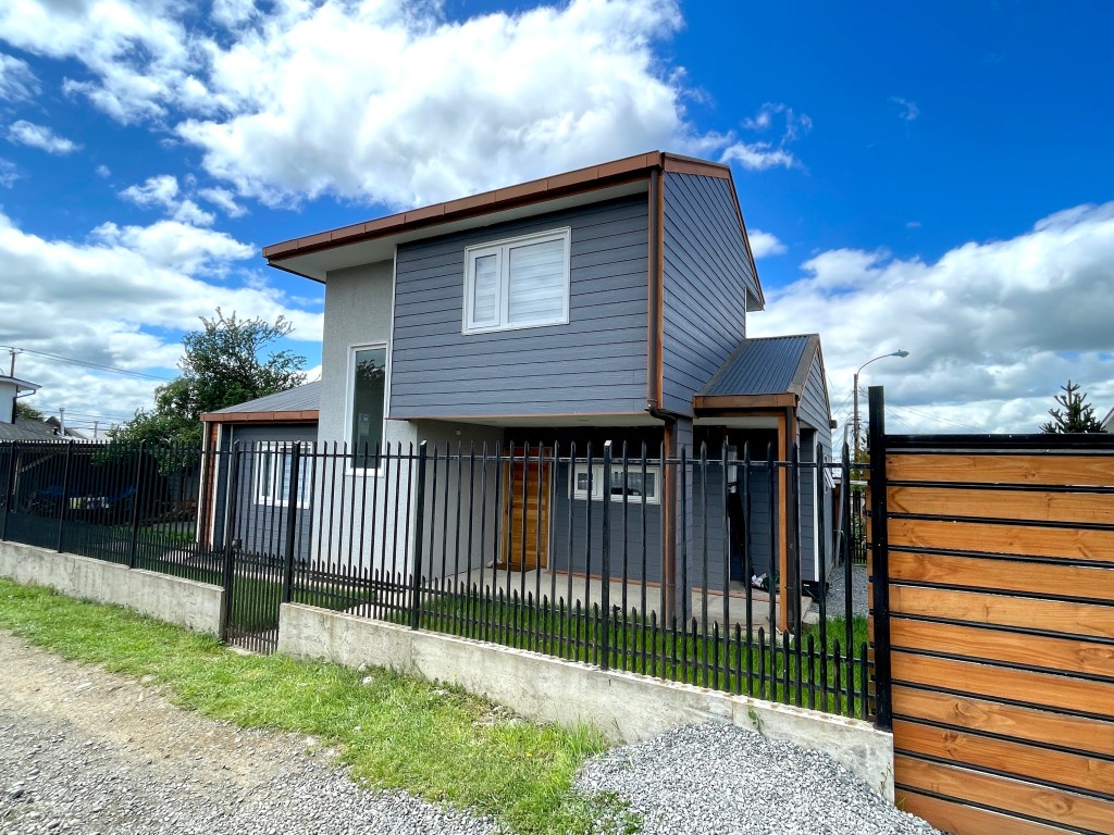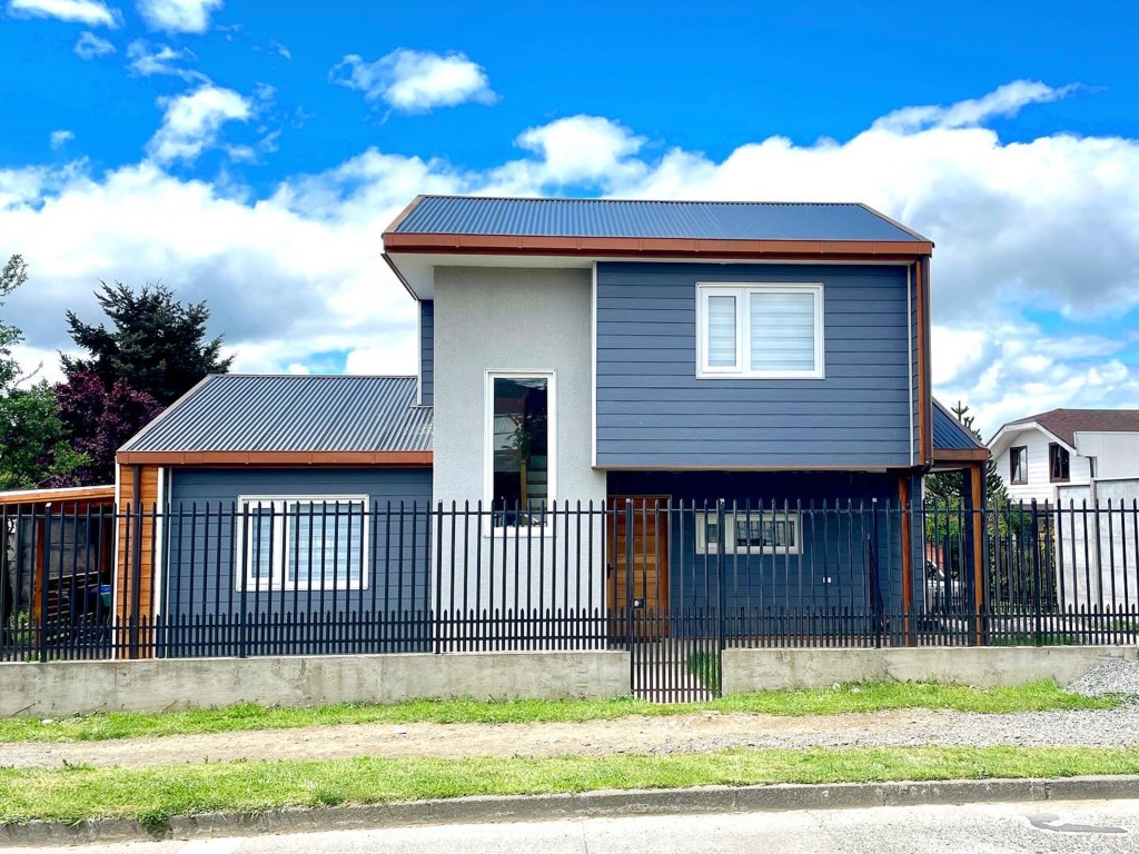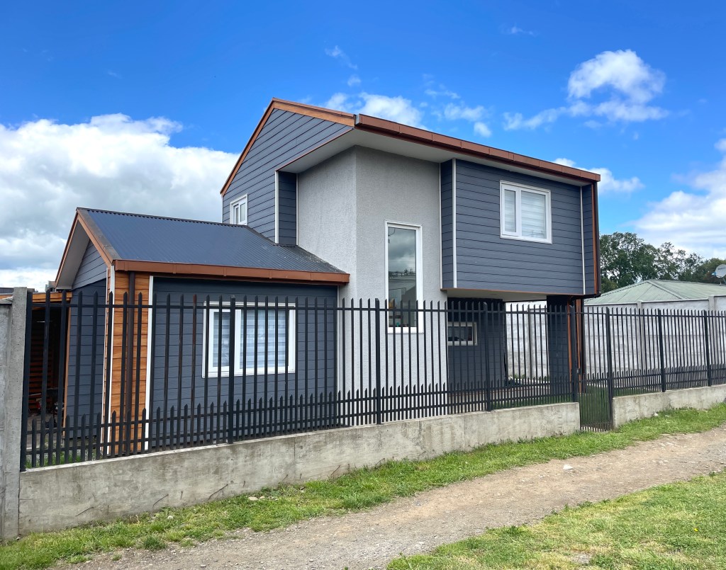 Casa F|M entre dos patios – Zona urbana de Osorno – año 2021 – Vivienda de dos niveles, con volumetría a dos aguas, de estilo moderno, de 98 m², la cual se emplaza entre dos patios, y consta de tres dormitorios, una sala de estar, comedor, cocina americana, dos baños, y una terraza techada.
