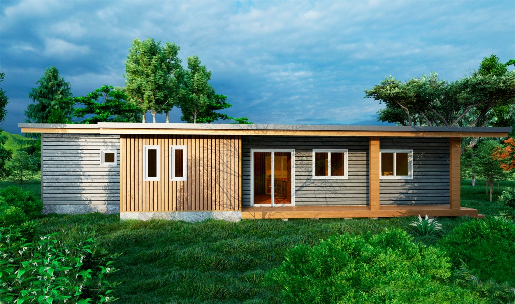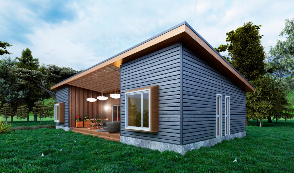 Casa GAP – Tiqueco, Río Bueno – año 2021 – Vivienda moderna de un nivel a una agua, de 125 m², la cual consta de tres dormitorios (uno en suite), estar, bar, comedor y cocina en un espacio central amplio, baño y una terraza techada.