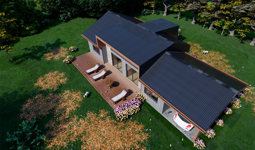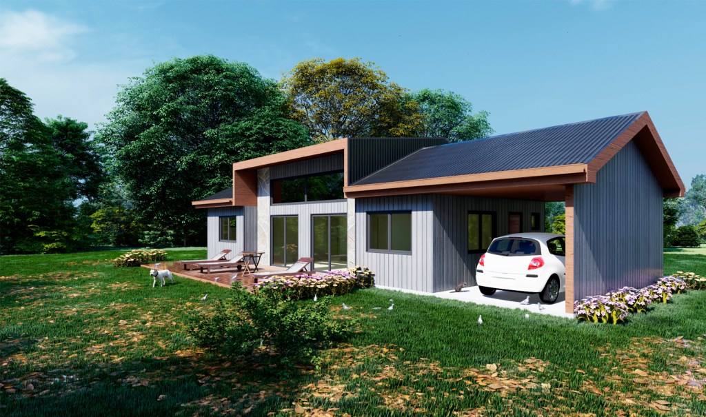 Casa Q|O – Queltehue – Osorno – Anteproyecto año 2021 – Vivienda de un nivel, con volumetría a dos aguas, de estilo moderno, de 101 m², la cual consta de dos dormitorios, una sala de estar, comedor, cocina americana, logia, dos baños, una oficina y un estacionamiento techado.