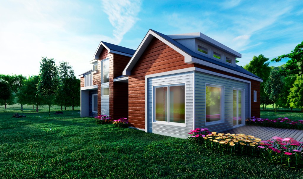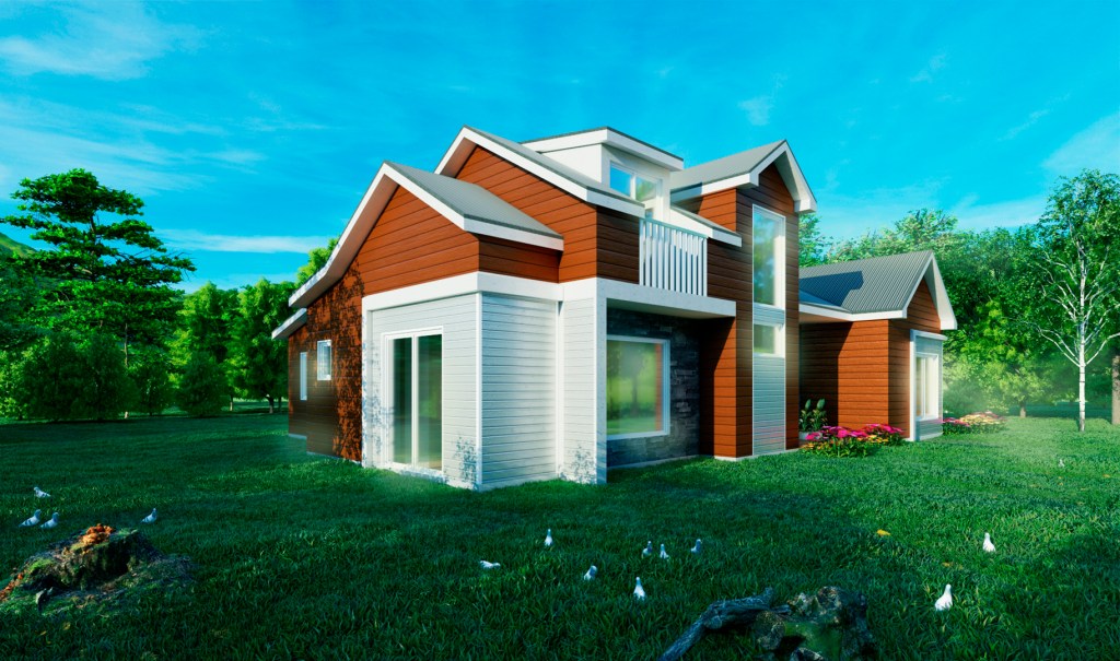 Revestida en fibrocemento y piedra.