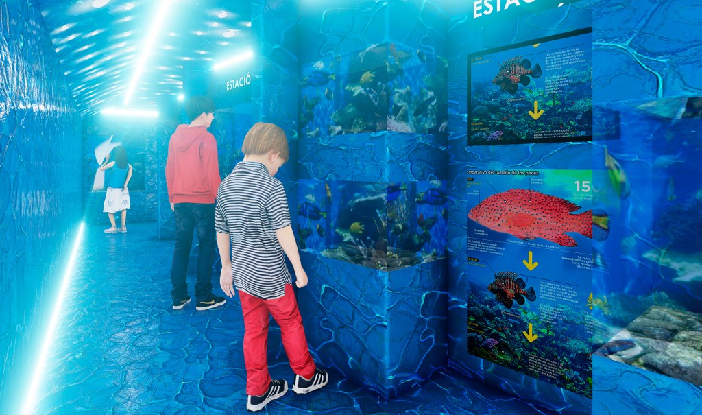 Estructurado en acero, con 3 zonas, una de circulación, otra con 13 acuarios de distintas dimensiones y finalmente una para la maniobra del operador. En la parte inferior hay 6 estanques los cuales están conectados a los acuarios.