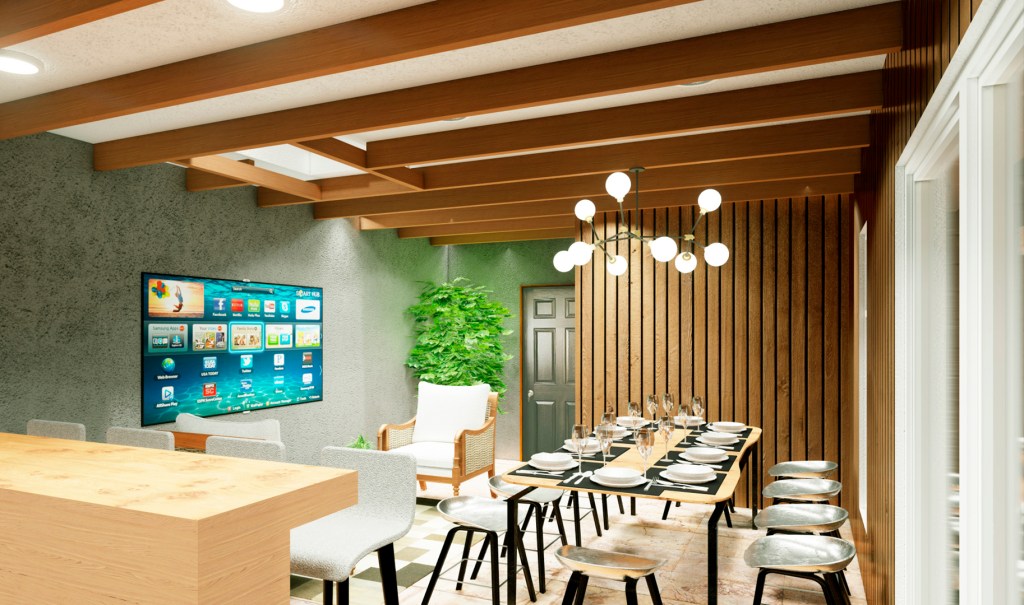 Esta conformado por un volumen emplazado en un patio trasero que sigue la linea de una casa existente. Cuanta con un espacio central (estar, comedor, cocina y zona de parrilla), y un baño.