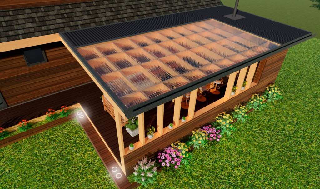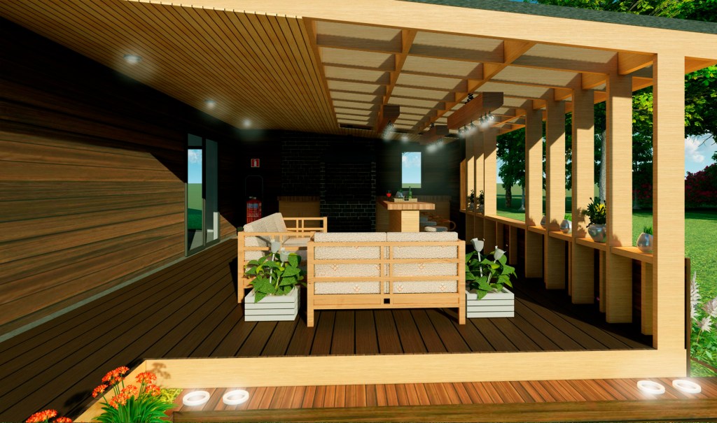 Terraza Los Aromos J-L – Osorno – año 2020 – Terraza semi abierta la cual se vincula con la casa existente conservado un estilo en madera. Con volumetría a una agua, con una fachada cerrada para el fogón y dos abiertas para la contemplación. Cuenta con un espacio central para el estar, de 42 m² y estructurada en madera.